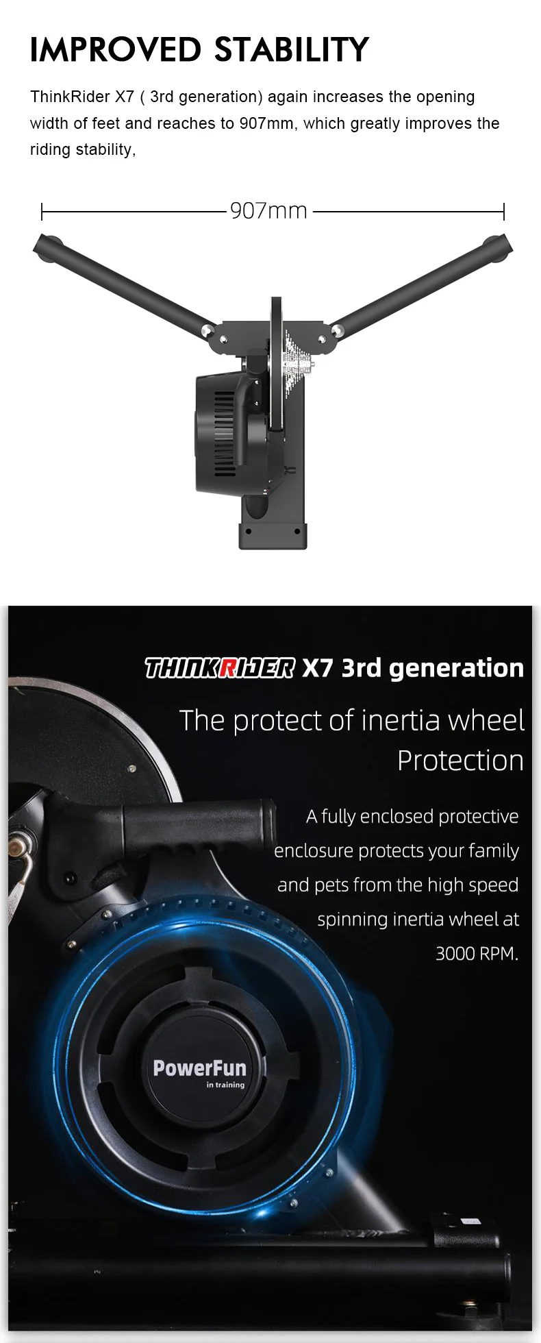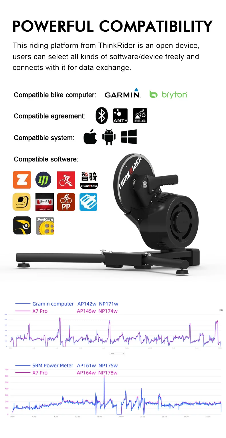 Quick Details • Place of Origin: China • Model Number: X7 PRO 4 • Structure: Y-type floating self-stabilizing platform • Net Weight: 21kg • Expansion Size: 59*91*48cm • Folding Size: 48*27*48cm • Damping Type: Electromagnetic coil • Drive Mode: Direct drive • Power Calibration: Automatic temperature compensation • Output Power: 0-2500 watts • Power Meter Error: ±2% • FREE GIFT SET: THINKRIDER MAT, ANT+ EXPAND, CASSETTE 11-28-11SP, CADENCE SENSOR ANT, Round quick release lever